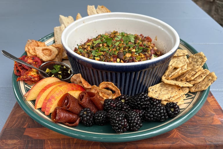A delicious combination of brie with jam, prosciutto, pistachios and garnish. This blend bakes beautifully into a warm, gooey dip for crackers or veggies.